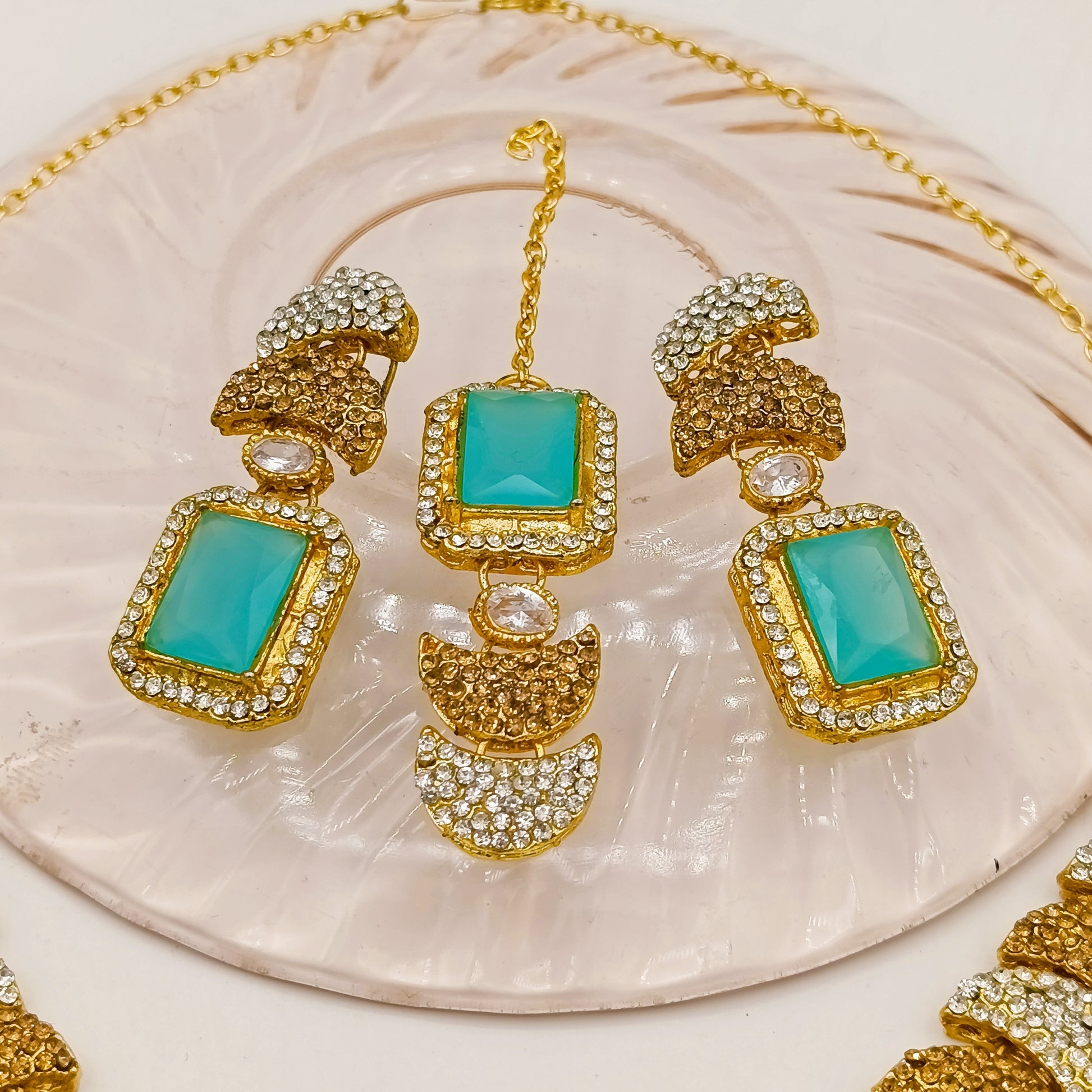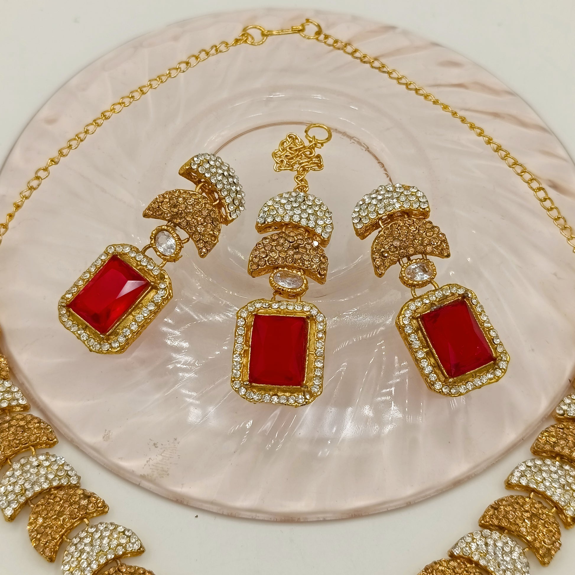 Elevate your traditional jewelry collection with these exquisite locket earrings paired with a matching bindiya set. Crafted in premium quality materials, this three-piece ensemble features stunning big stones in rich red, pink, and green hues that complement any occasion. Each piece showcases elegant, unique design work that reflects sophisticated craftsmanship. The locket earrings offer versatile styling options while the bindiya adds an authentic finishing touch. Perfect for celebrations, weddings, or everyday elegance, this set combines timeless appeal with contemporary flair. A must-have for those who appreciate refined, distinctive jewelry pieces.