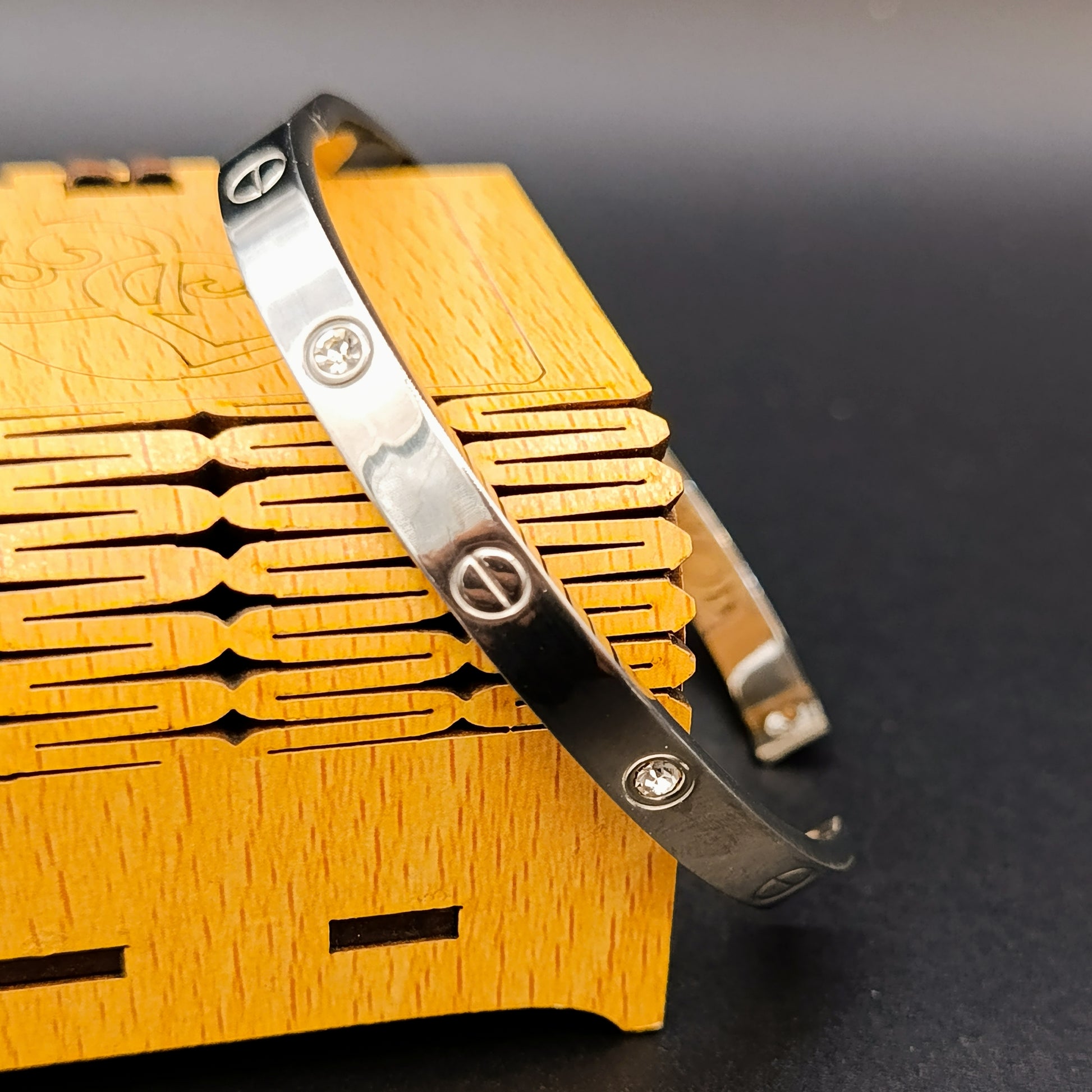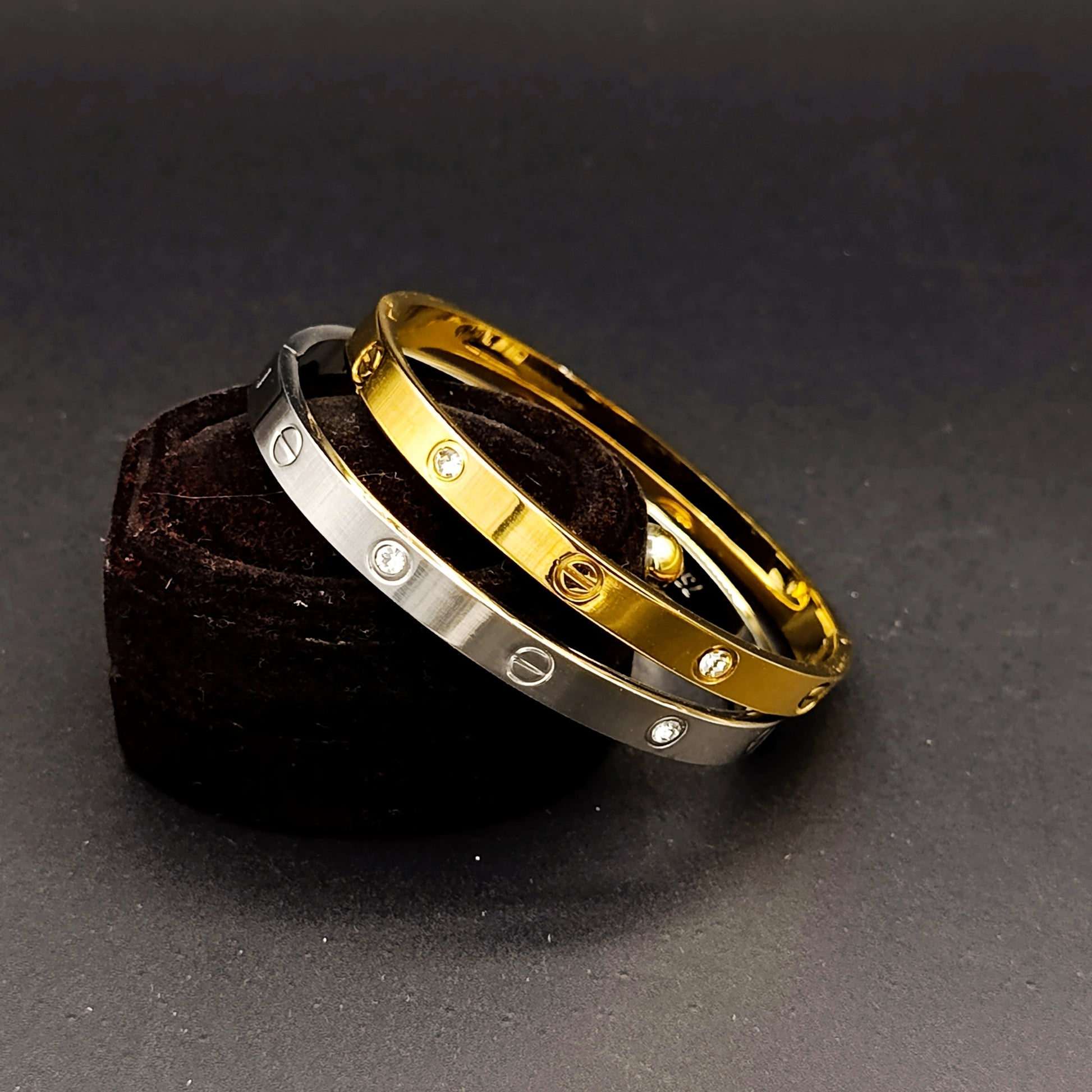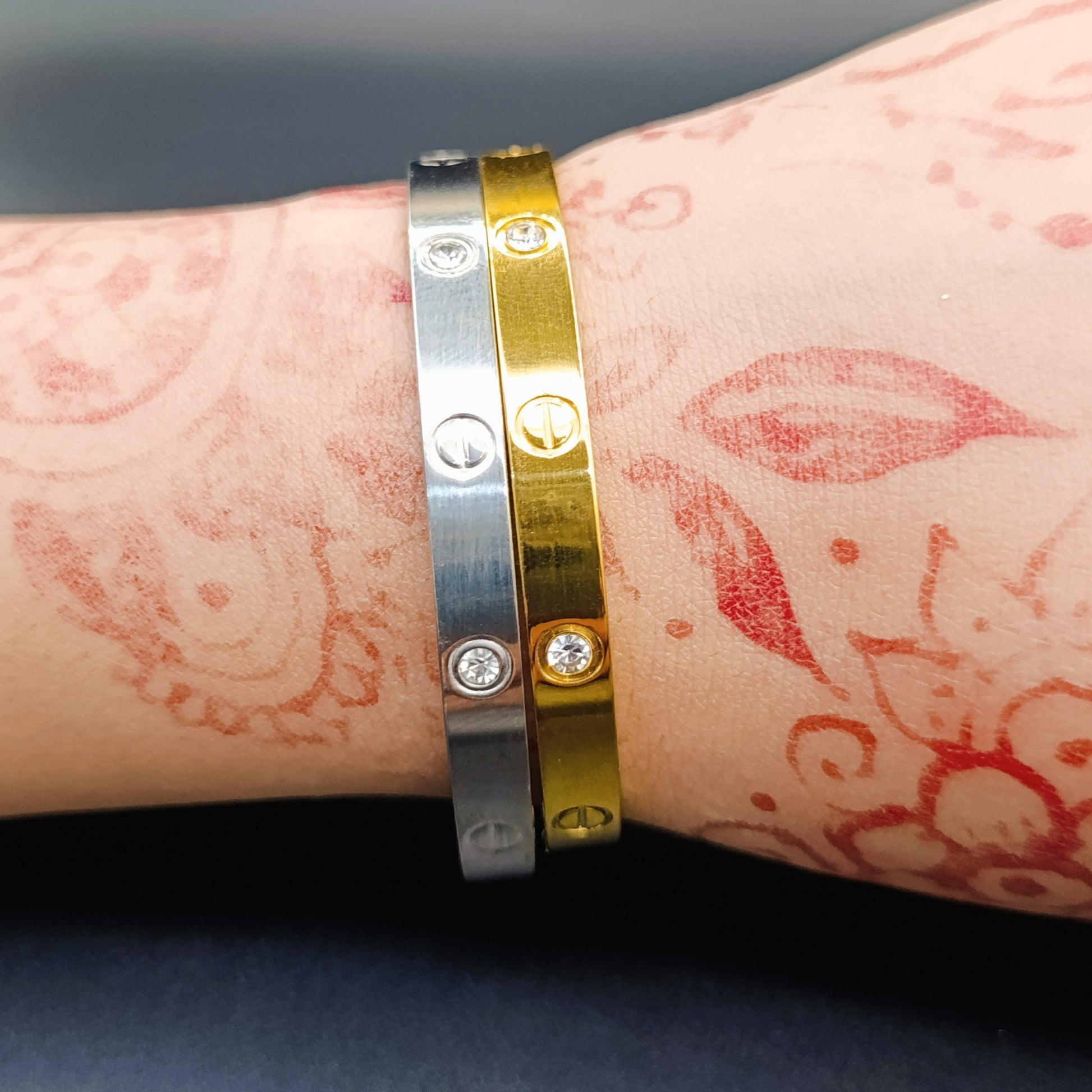 Crafted from premium stainless steel, this adjustable kara features zircon diamond stones in elegant silver and gold tones. Designed for a comfortable fit with a free-size adjustment, it maintains its color without fading, ensuring lasting quality and style.